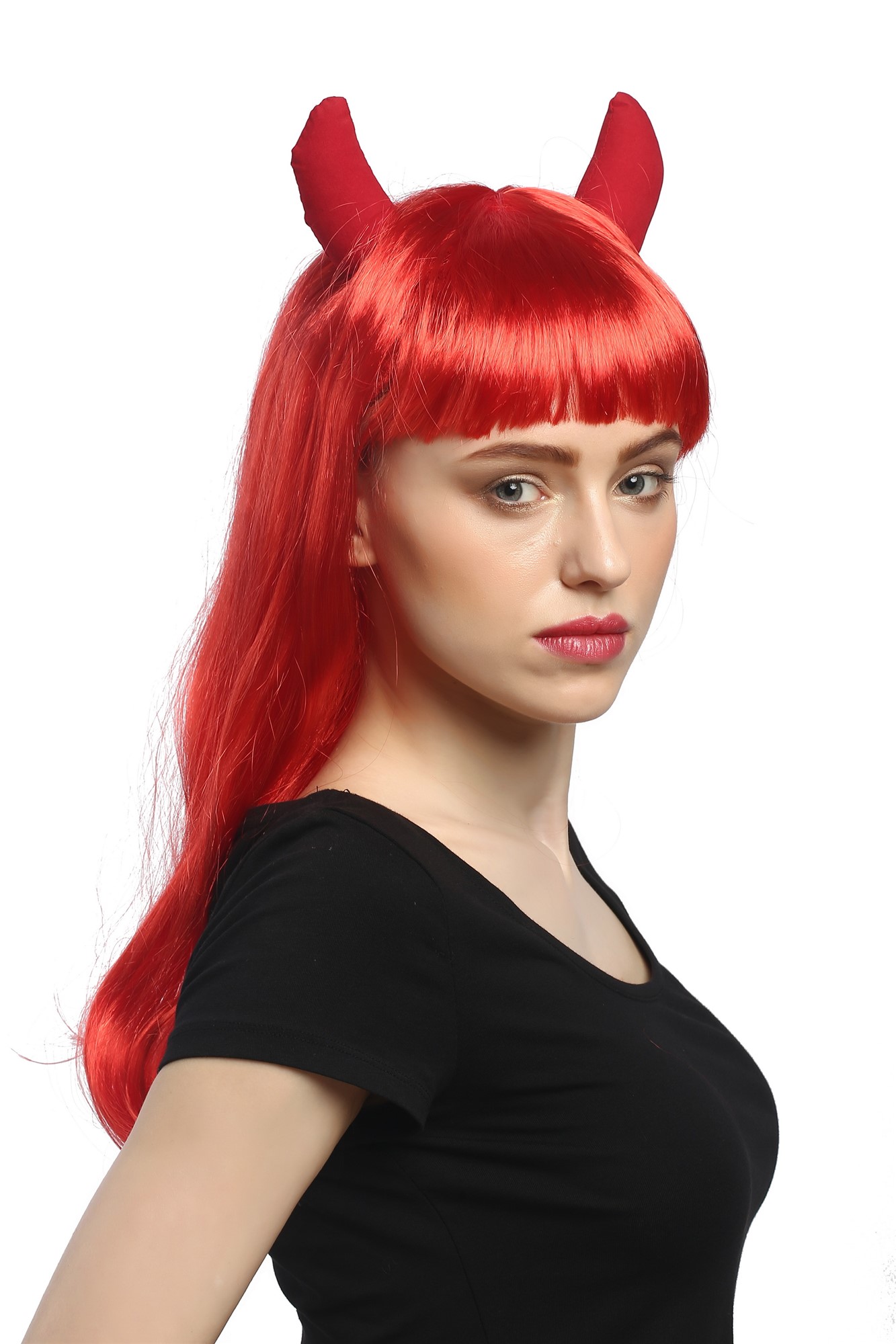 Lady Party Wig Halloween Retro Pin-Up She-Devil Demon red long bangs horns 90897