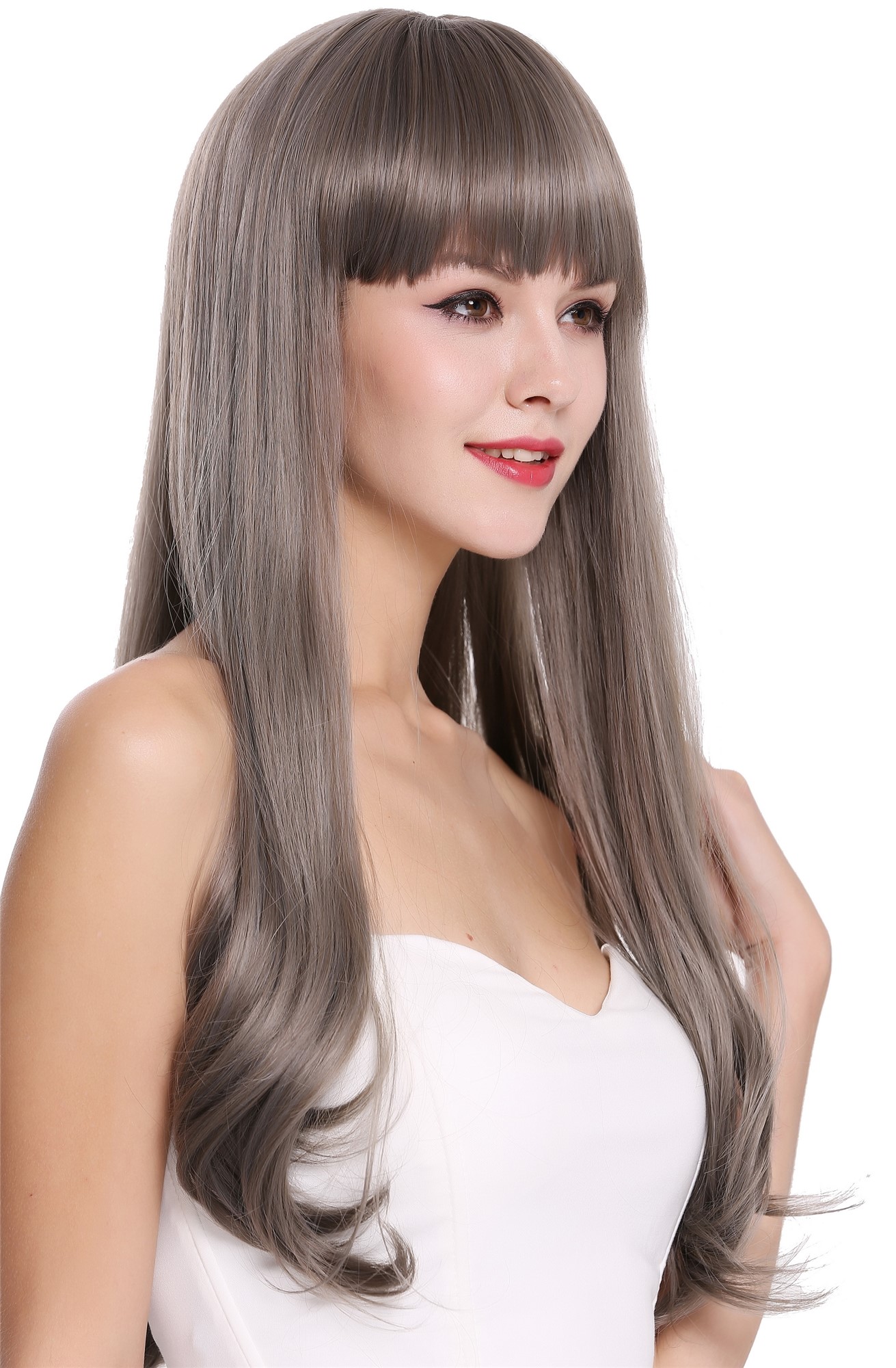 Extravagantly beautiful women's wig with enchanting fringe. The long hair is mostly sleek, but has sightly waved tips. The hair colour is a real eye catcher- a mix of ash grey and a fair brown/ greyish brown.