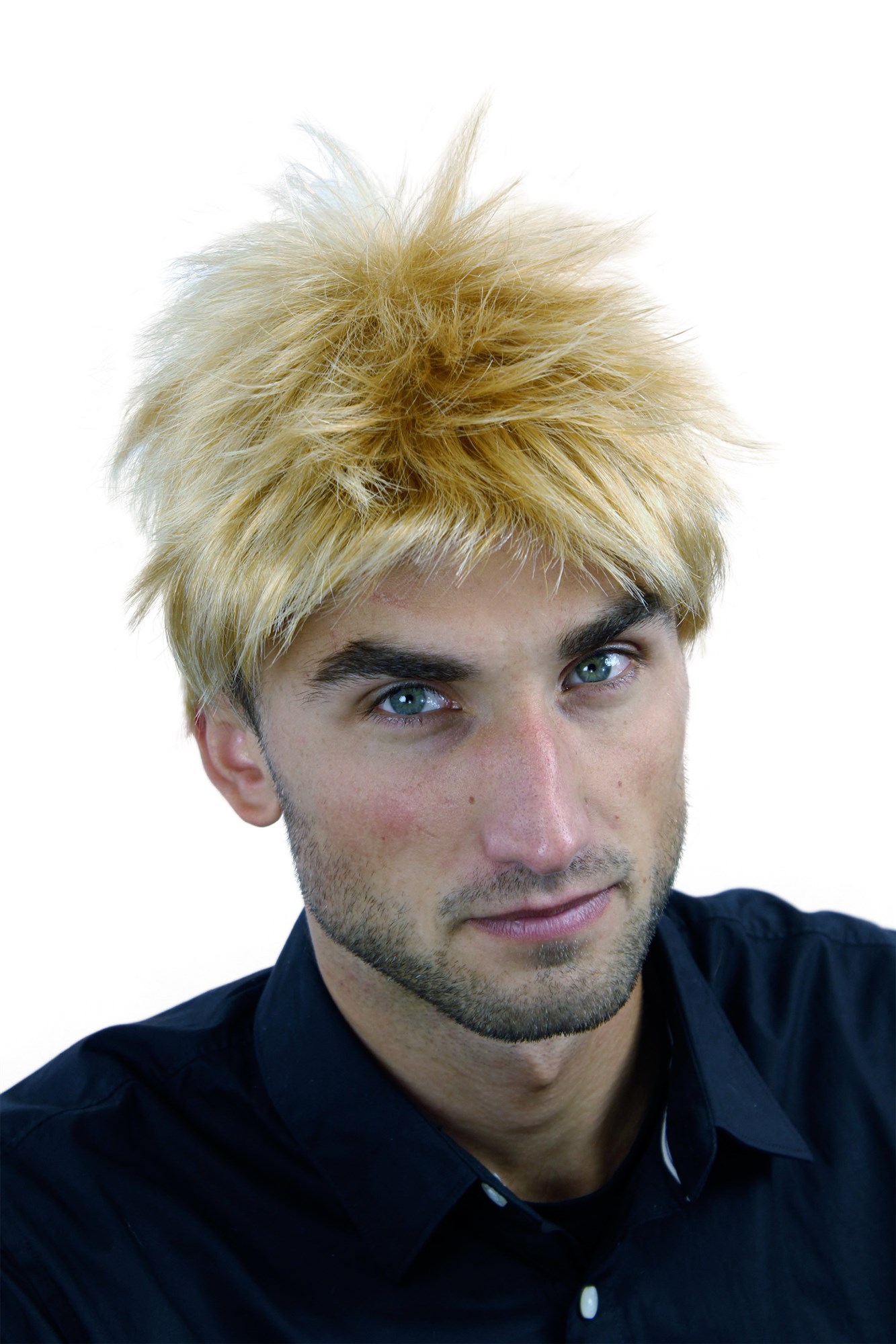 Quality wig for the gentleman with short hair teased up in a wild and youthful fashion, the colour is a mix of golden blonds..Handsome and very natural looking wig made for WIG ME UP ® of high quality synthetic fiber. Suitable up to a maximum head circumference of 60 cm, but easily adjustable to smaler sizes with elastic straps and hooks sewn into the hairnet. Comes with care instructions in English, Spanish, Italian and German. Discreet shipping.Product no.: TC-1012-22T/144+A51(F139)
