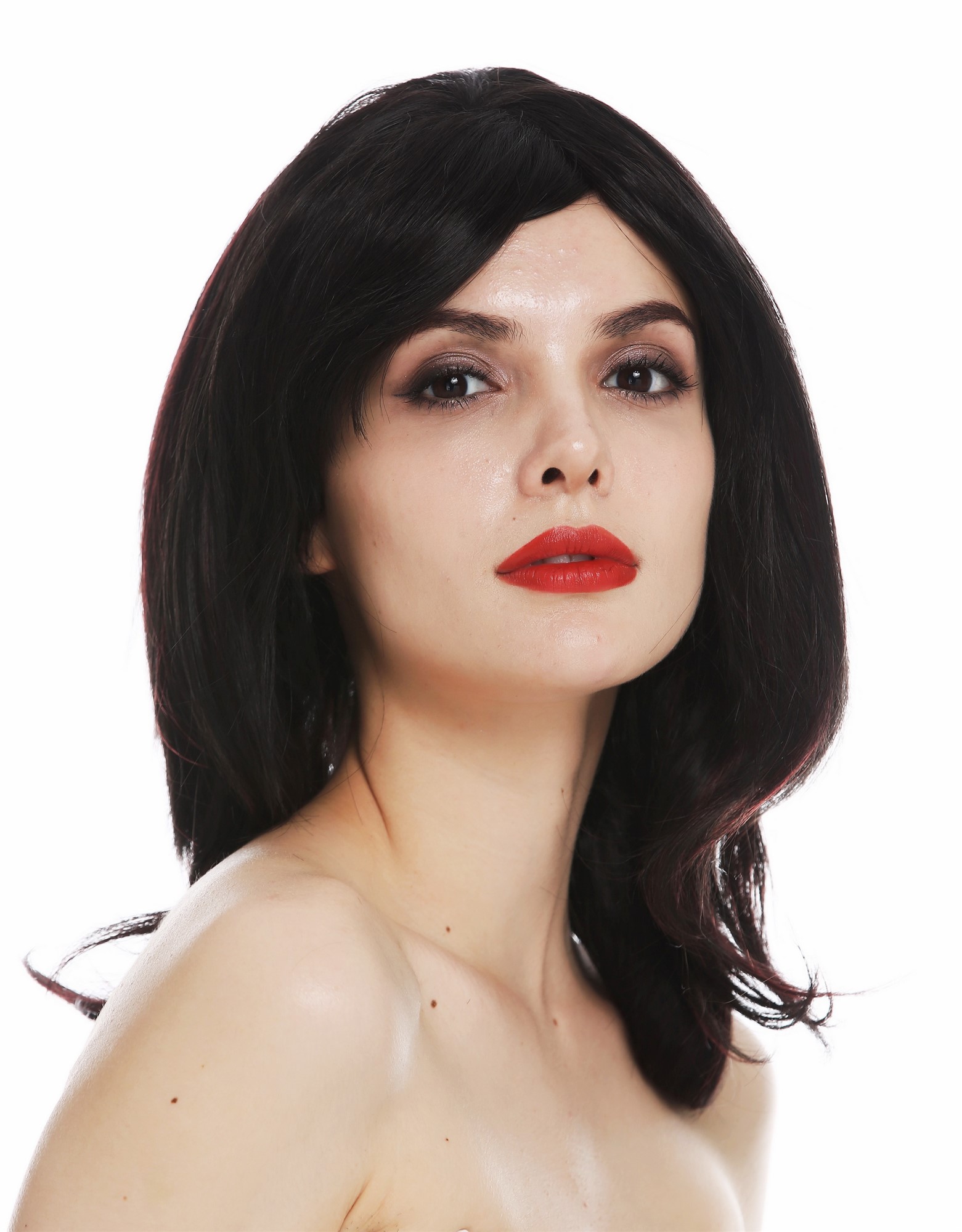 Medium long, quality women's wig with layered hair that gets slightly shorter towards the face. The slightly backcombed under hair provides great volume for this otherwise sleek wig. The black hair is lightened up with aubergine red highlights.