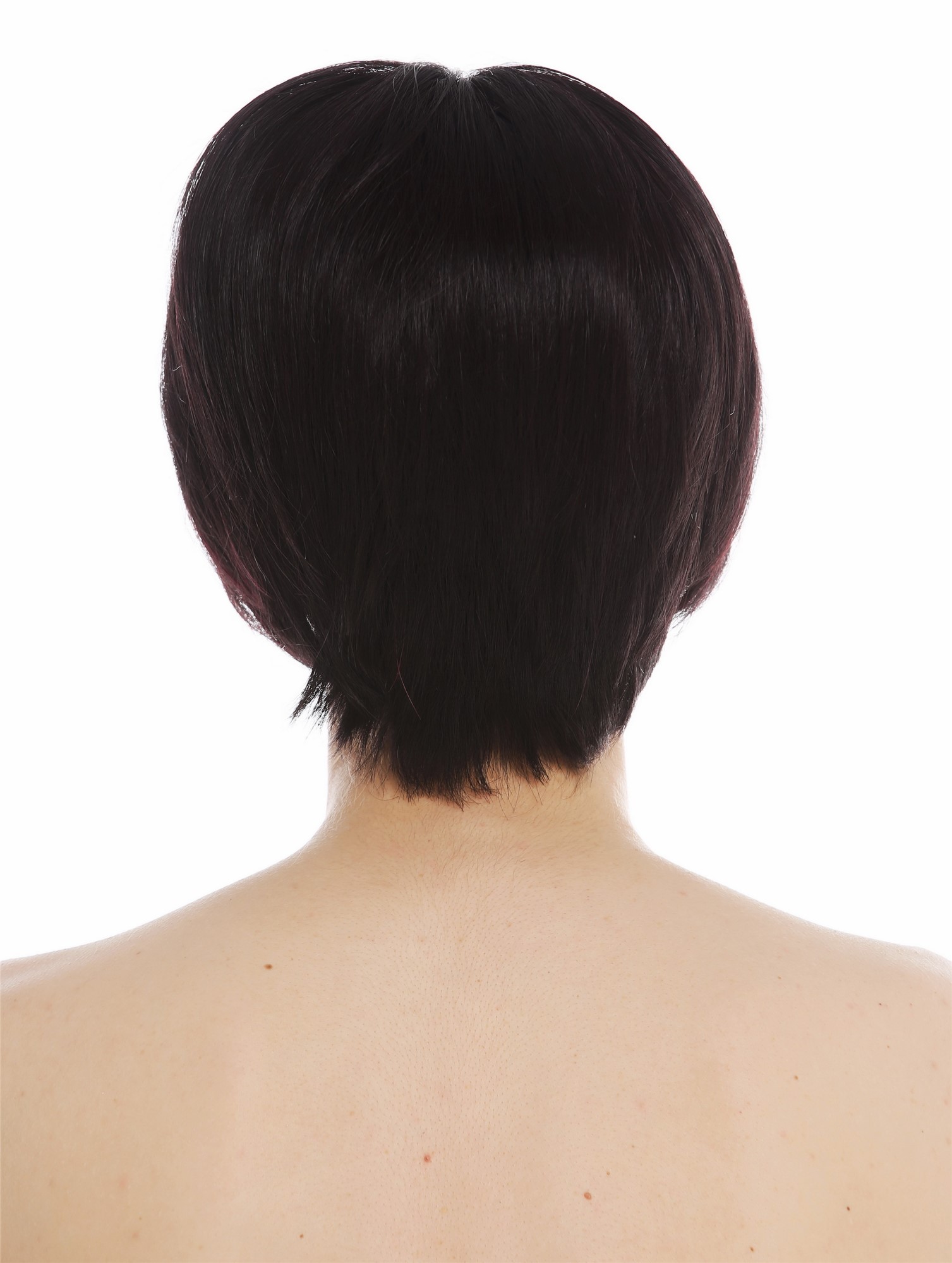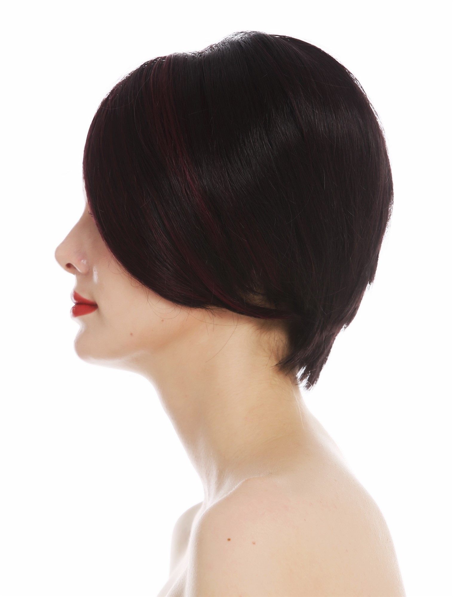 Short bob for women with almost the same length all around from the parting to the neck area – the colour is a mix of aubergine red (99J) and mahogany brown (33M).