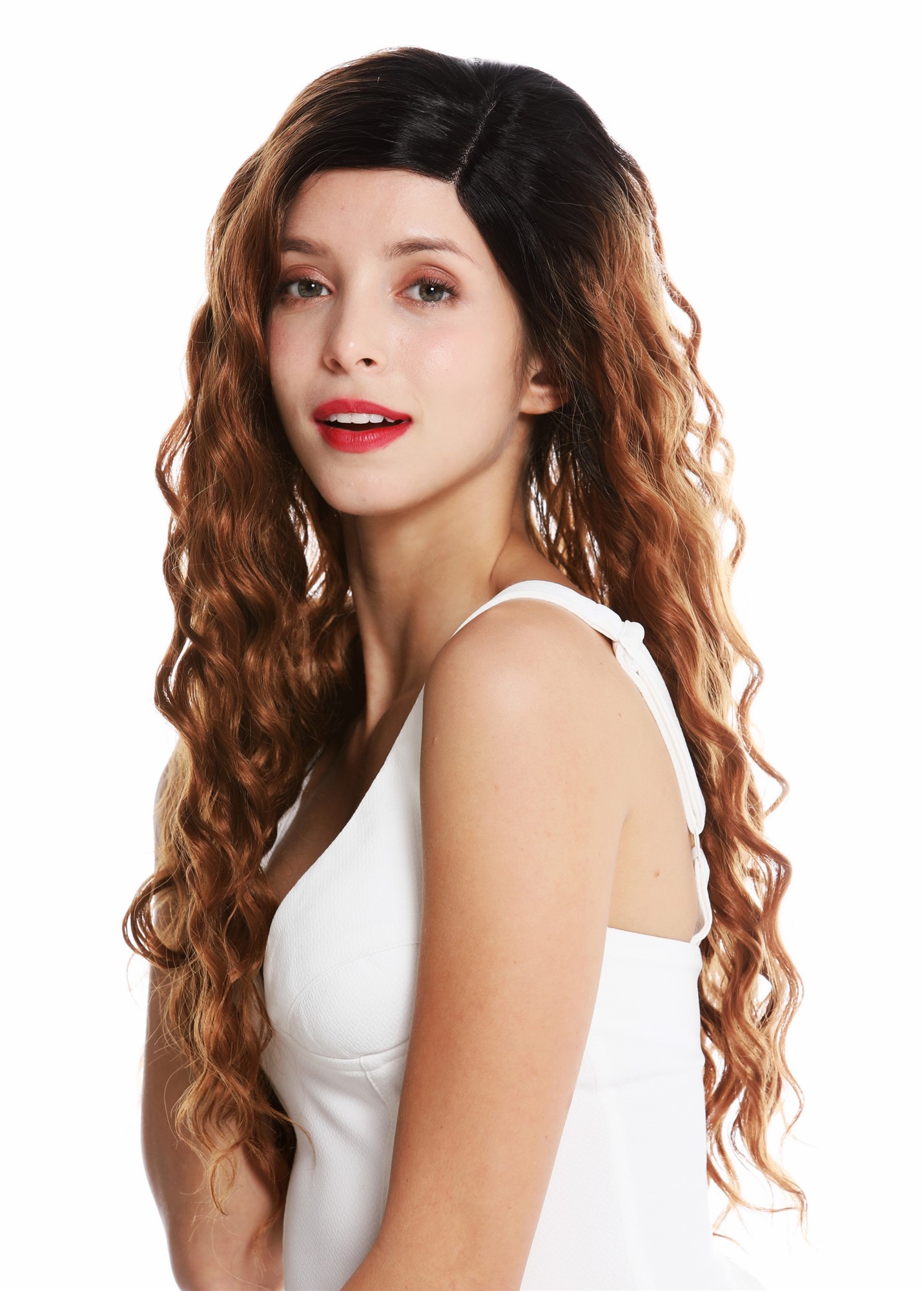 Elaborately hand made women's wig with a partial monofilament at the parting and lace front allowing a very natural parting and hairline. The 25.5 inches long hair has luxurious curls, dyed an ombre and balayage mix – The black hairline fades into a mix of dark blonde and dark copper brown highlights.