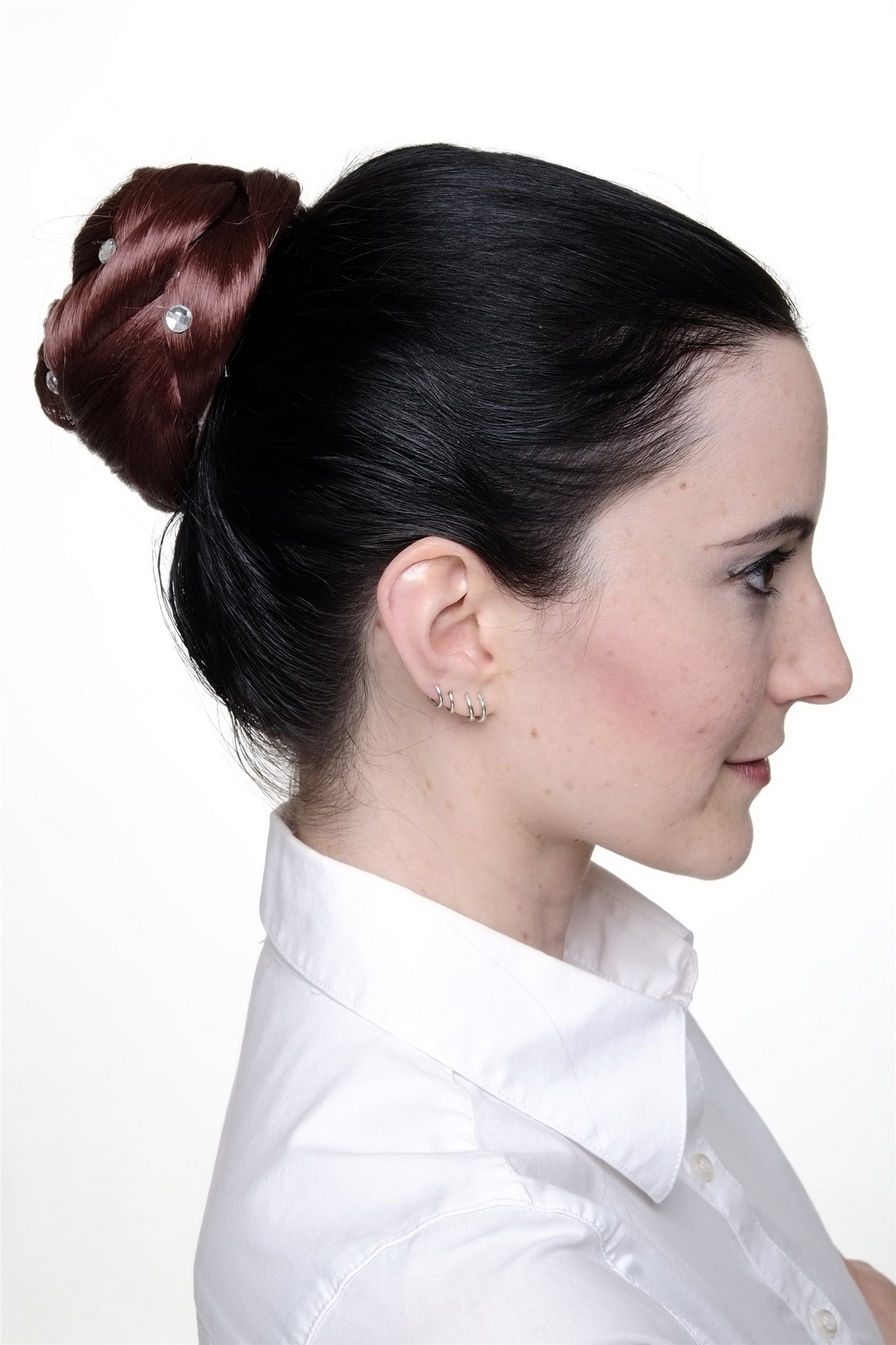 Rotbrauner, aufwendig geflochtener Haarknoten oder Dutt zwischen Traditionen und kesser Postmoderne - glamourös verzaubernd mit eingesetzten Strass-/ Glitzersteinen. Die Leichtigkeit der hochwertigen Kunstfaser und die Verarbeitung mit Steckkamm garantieren einfache Anbringung und einen hohen Tragekomfort.